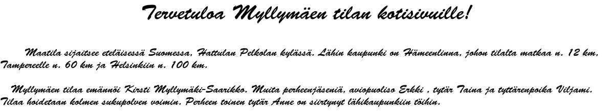 Myllymäen tila Yhteystiedot: Mail: postmaster@myllymaentila.fi Talvista jaloittelua Nykyinen navetta Ihania ! Valoisat karsinat. Vasta syntynyt. Akbar tarkastuskierroksella. 100.000 Kg Maitoa ! Papua juhlittiin saavutuksen johdosta.